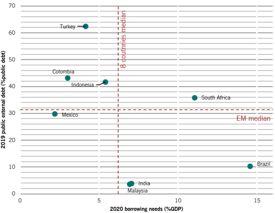 縦軸:2019年の対外債務(%、公的債務総額比)、横軸:2020年の借り入れニーズ(%、GDP比)