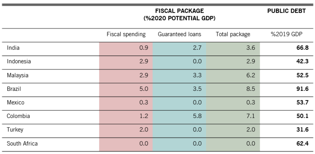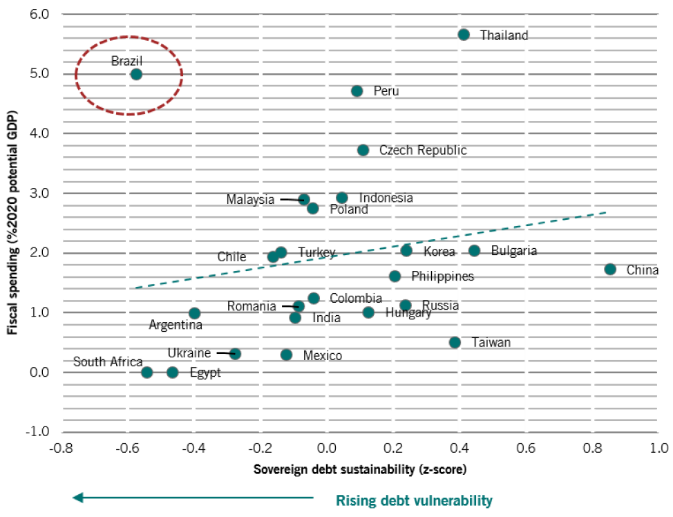 ブラジルを除くと、新興国の財政悪化の度合いは、先進国よりも遥かに小さいはずです。GDP比で見た直接的な財政刺激は、先進国の4.2%に対し、新興国は1.6%に留まるからです。また、新興国は民間セクター向けに保証付き融資を供与することについて、先進国よりも遥かに慎重な姿勢を維持してきました。