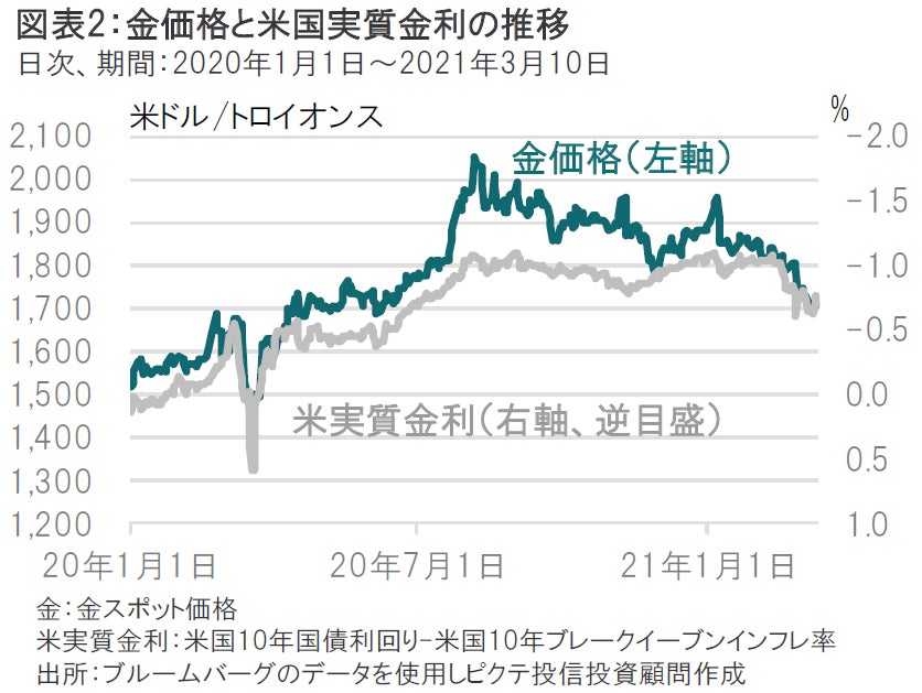 新型コロナウイルスのワクチン接種の進展などを受けた景気回復期待や米国金利上昇などを受けて、足元、金価格は軟調な動きとなっています。一方で、米国の実質金利の水準や米ドルの水準などは、金価格を下支えする要因となる可能性があると考えます。