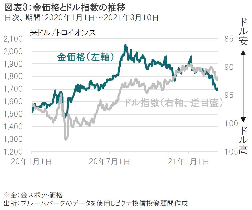 世界の主要通貨に対する米ドルの動きを示すドル・インデックスの推移をみると、足元では2020年末から2021年2月頃にかけての底値から反発しています(図表3参照)。金は価値保存手段として米ドルの代替資産とみなされており、米ドルと金価格は逆方向に動く傾向があります。足元で米ドルが上昇していることは金価格の下落要因ではありますが、それでもなお、ドル・インデックスの水準は依然として低く、昨年8月の水準をいまだ下回っています。今後、米国金利の上昇の落ち着きによる米ドル安は、金価格にとって追い風になる可能性もあります。
