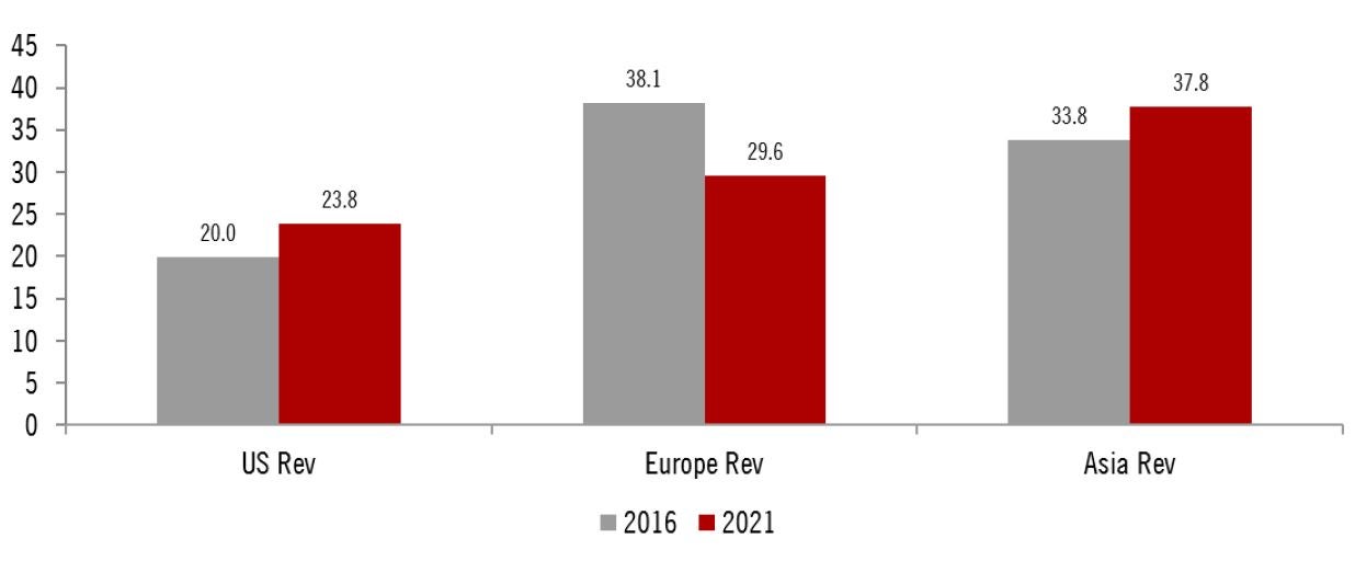 主に、欧州企業で構成されるラグジュアリー・セクターは、中国を中心としたアジア地域の富の増加を受け、過去10年を通じて拡大基調を辿ってきました。一方、足元では、中国経済の減速と、デルタ変異株の拡散を巡る懸念ならびに規制の強化や富裕層を標的とした所得再分配税の導入を巡る言及とが相俟って、中国市場ならびにアジア地域に収益を大きく依存する当セクターの強い下押し圧力となっています。図表7は、世界のラグジュアリー企業の収益の地域別内訳を示しています(足元では、中国が際立って高い比率を示しています)。