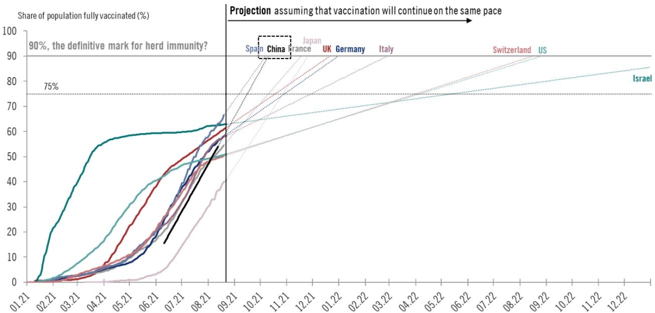 中国のワクチン接種率はピークを付けた後、鈍化し始めており、デルタ変異株が猛威を振るい続ける状況下、新たな逆風となりかねません。また、シノファームおよびシノバック両社が開発・製造した国産ワクチンのデルタ変異株に対する有効性を巡るデータの透明性や研究に欠けることも、第5波の先行きを巡る不透明感が増す一因となっています。図表4は、現行のペースでワクチン接種が継続するものと仮定した場合、中国の完全接種率(2回接種)が2021年10月中に90%に達する可能性を示唆しています。