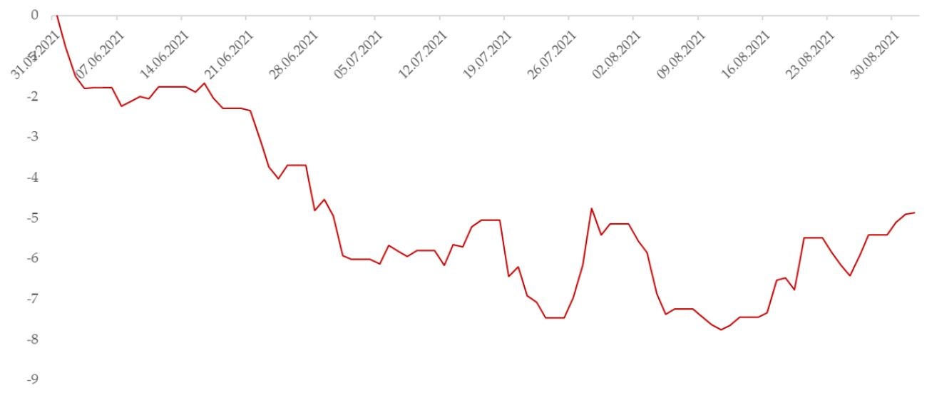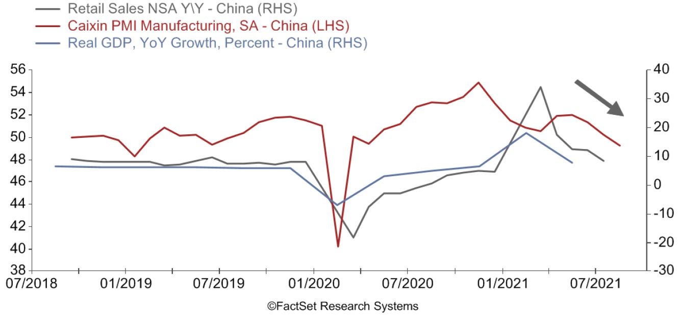 消費関連指標では、8月の小売売上高が前年同月比+2.5%とコンセンサス予想の+7.0%ならびに前月の+8.5%を下回り、財新発表の8月の製造業購買担当者景気指数(PMI)も49.2と(景況の分かれ目とされる)50を割り込んで、コンセンサス予想の50.1、前月の50.3をいずれも下回りました。一方、4~6月期の実質GDP(国内総生産)成長率は前年同期比+7.9%と、1~3月期の+18.3%に続き、回復基調を辿っています。