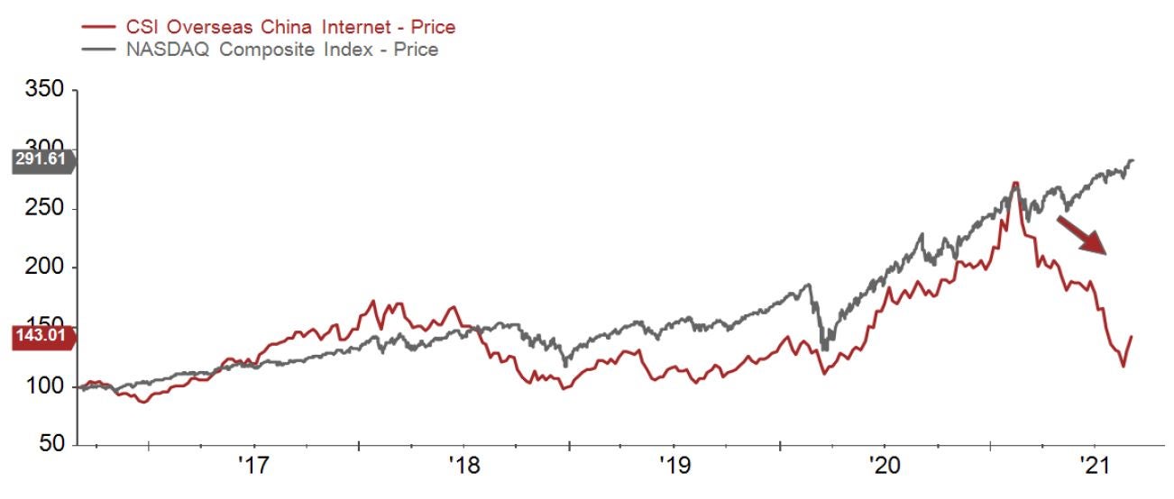 図表1:CSI中国インターネット指数とナスダック総合指数の推移