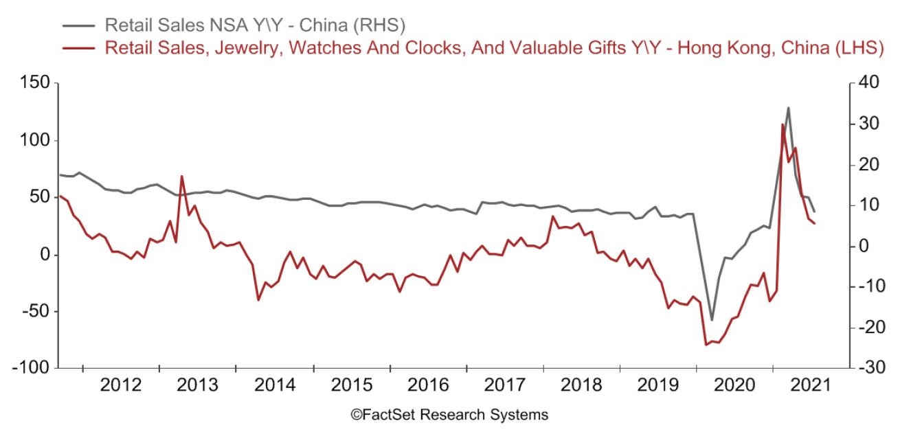 ラグジュアリー市場については、経済再開後の「リベンジ消費」が旺盛で、2021年年初以降の売上は前年比+110%に達しています。(比較の基準が低いことによる)ベース効果の消滅に伴って、前年比増収率は正常に戻りつつあるものの、依然として高水準を維持しています。