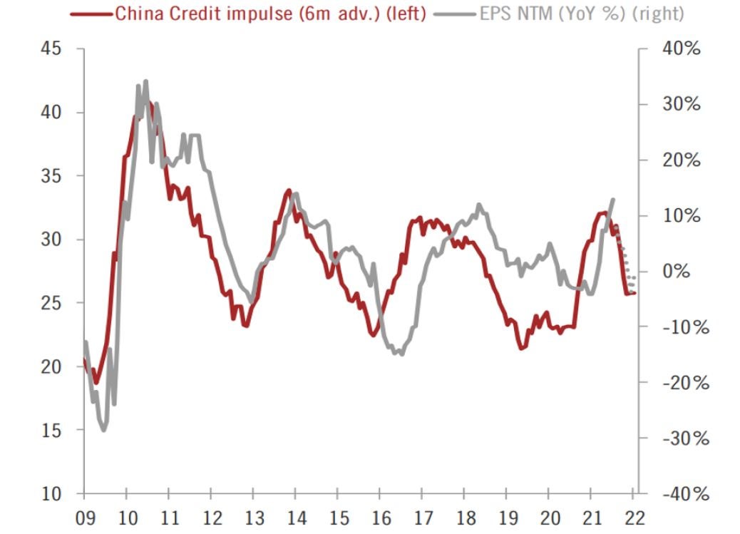 図表5:中国クレジット・インパルス指数(6ヵ月先行、左軸)とMSCI中国A株指数の一株あたり利益(12ヵ月先予想EPS、前年同月比、右軸)