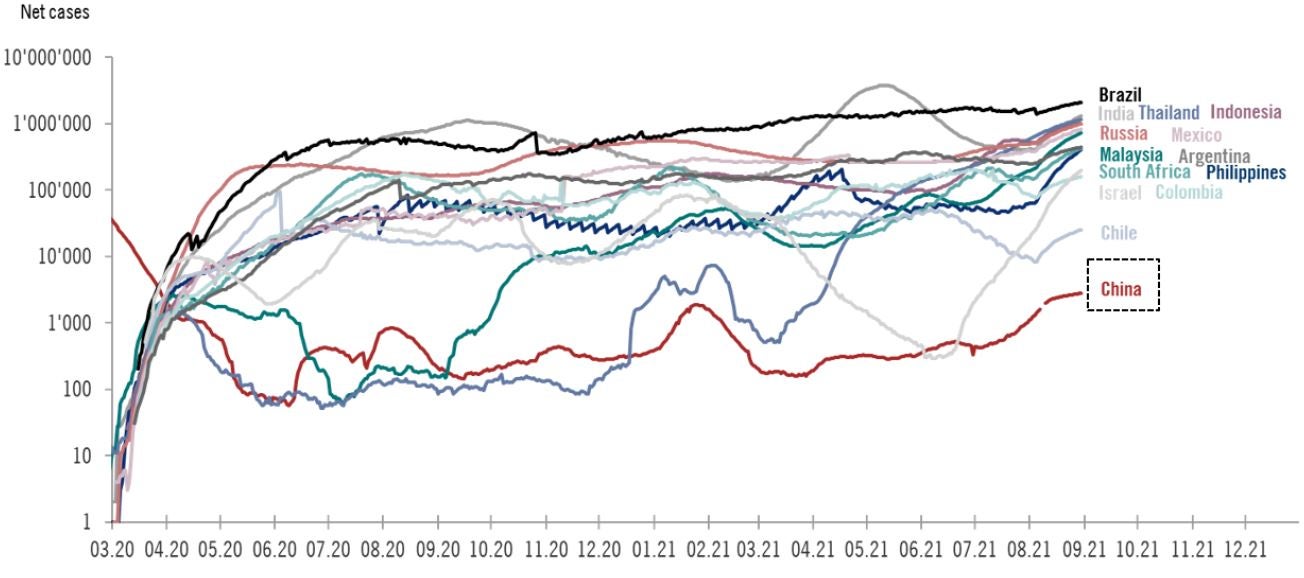 ピクテでは、中国経済の正常な水準への回帰、新型コロナウイルス感染拡大に伴う行動規制の強化の可能性、購買担当者景気指数(PMI)の悪化等、最新の動向を勘案し、2021年通年の実質GDP成長率予想を下方修正しました。コロナ感染拡大の再来を回避するため当局が打ち出した「感染者ゼロ政策」が経済成長を下押していることには留意が必要です。政府は、デルタ変異株の拡散を受け、主要都市での検査体制を拡充し、移動規制を強化していますが、8月初旬時点では、中国全土32省のうち、17省で143人の感染者が出ているに過ぎません。