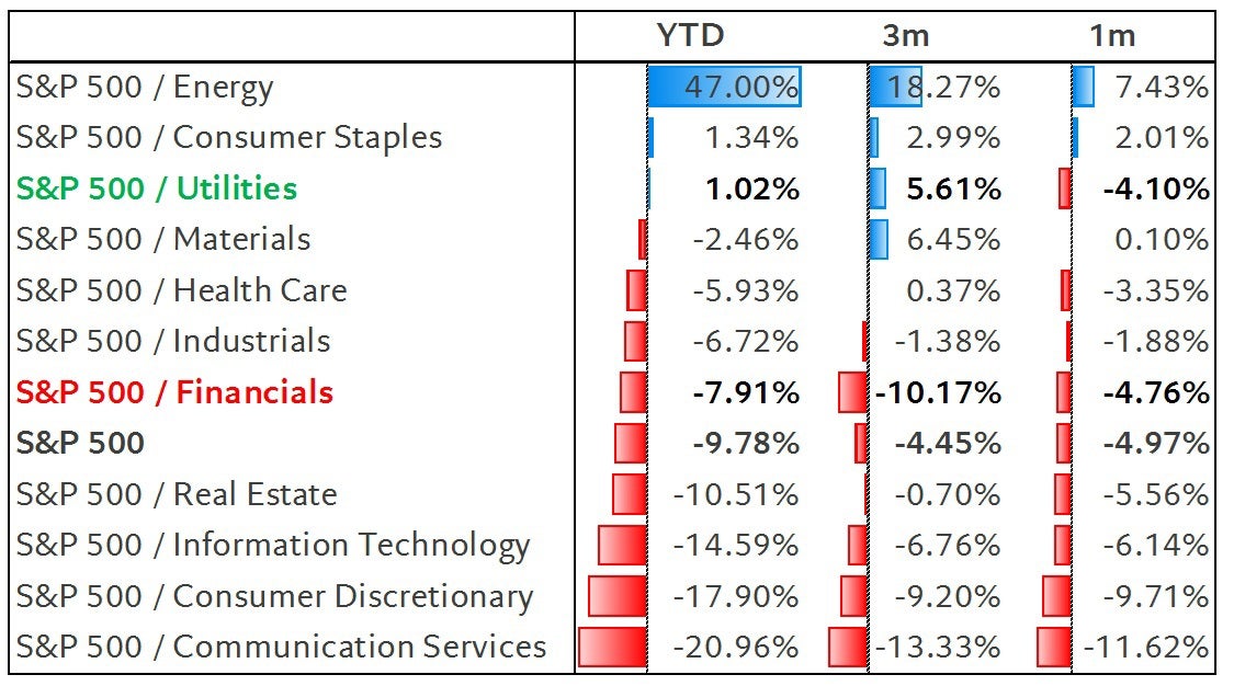 米国の公益株式は、年初からかなり底堅い動きをしています。下表は、米国株式(S&P 500)の各セクターの年初来(YTD)、過去3ヵ月間(3m)および過去1ヵ月間(1m)のパフォーマンスを示しています。S&P500が同期間に約10%下落したのに対し、米国公益株式(S&P 500/Utilities)は年初来でプラスのリターンを記録しています。一方、米国金融株式(S&P 500/Financials)は苦戦しており、特に過去3ヵ月のリターンは10%以上のマイナスとなり、米国株式と米国公益株式の両方を下回っています。一方、過去1ヵ月間に見られた急激な売りの中で、米国公益株式も苦戦を強いられました(-4.1%)が、米国金融株式、米国株式、その他多くのセクターと比較すると、比較的底堅く推移しています。