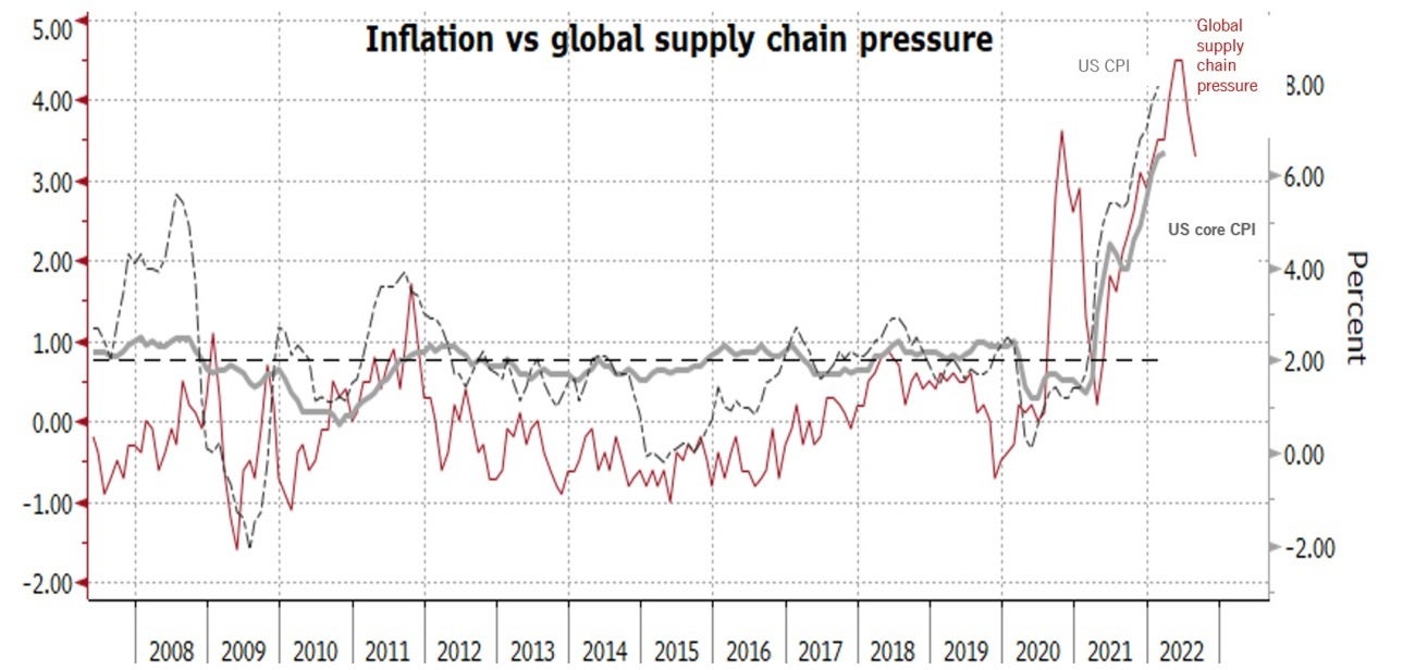 しかしながら、中国での新型コロナウイルス感染拡大による都市閉鎖(ロックダウン)の継続・再開があったなかで、世界的なサプライチェーンの圧力が現在緩和されている兆候が見られたことはCPIがピークに達した可能性があるとの見方をサポートしています。