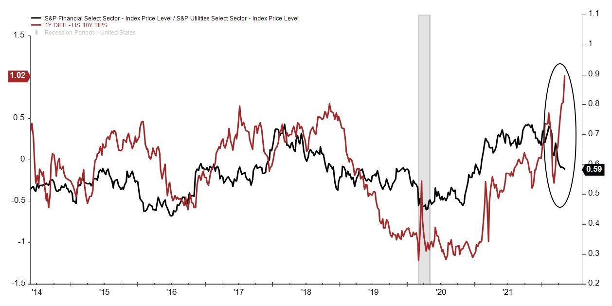 金融株式と公益株式は金利に対する感応度が全く異なります。前者が実質金利(特に長期金利)の上昇から利益を得る傾向があるのに対し、公益セクターは資金調達を負債に大きく依存しているため、後者は長期金利上昇時には負債の利払いの面からは苦境に立たされる傾向があります。