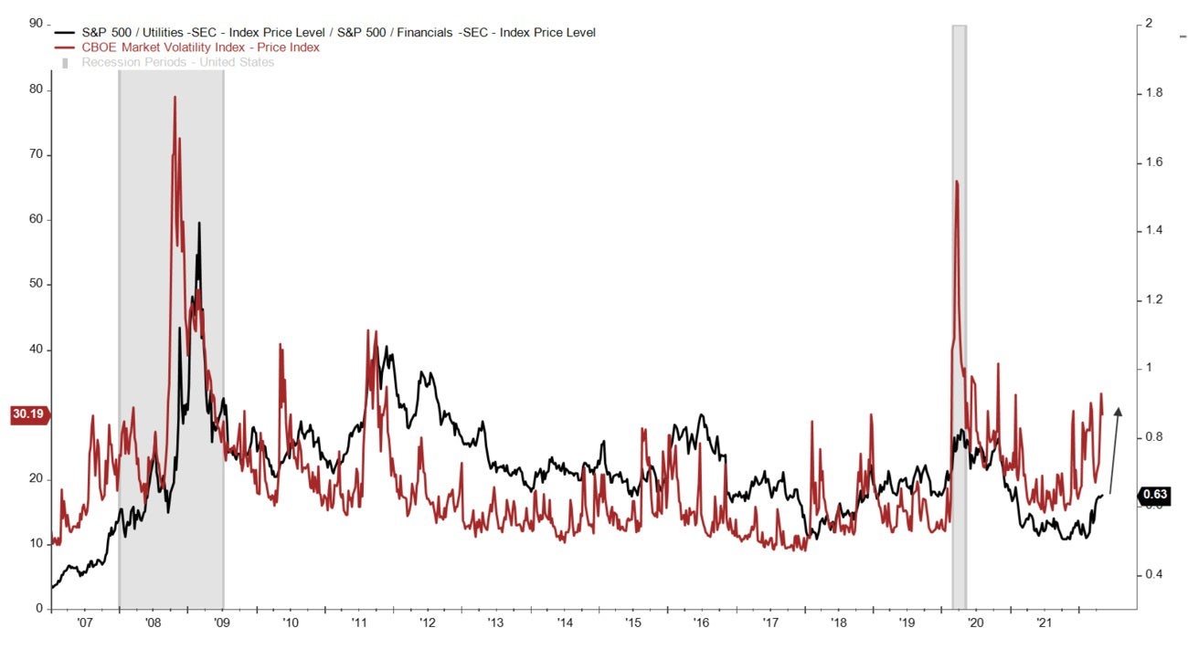 ロシア・ウクライナ紛争、インフレ圧力の高まり、FRBの引き締め、世界的な成長の鈍化など、現在進行中の無数のリスク要因により、金融市場はボラティリティ(価格変動)の上昇に揺らいでいます。VIX指数(米国株式市場の30日間予想ボラティリティの指標)は2021年末から継続的に上昇しており、それ自体も大きなボラティリティの変動を経験しています。歴史的に見ると、不透明な時期(VIXが上昇しやすい時期)には投資家がディフェンシブセクターを好む傾向があるため、公益株式の金融株式に対する相対パフォーマンスはVIXに(多少の遅れはあるものの)連動しています。このように不確実性の高い世界情勢を背景に、VIXは今後数週間にわたり高水準で推移する可能性があり、その結果、公益株式が金融株式よりもさらにアウトパフォームする可能性があるとみられます。