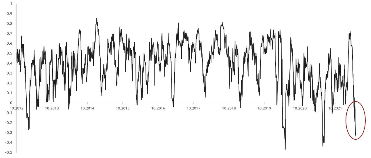 上記の通り、現在、米国金融株式の米国公益株式に対する相対パフォーマンスと米国金利の相関はマイナスに転じています。しかし、歴史的に見ると、この負の相関はマイナスに転じた後、すぐに元に戻る傾向があります。