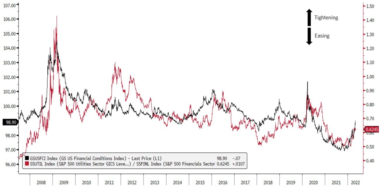 米国公益株式の米国金融株式に対する相対パフォーマンスとゴールドマン・サックス米国金融環境指数(financial conditions index (FCI))