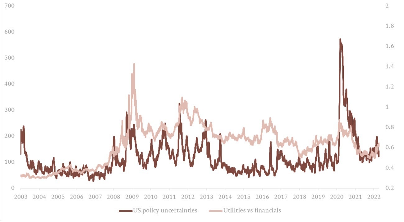 政策の不確実性が高まると、通常、公益株式が金融株式をアウトパフォームする傾向