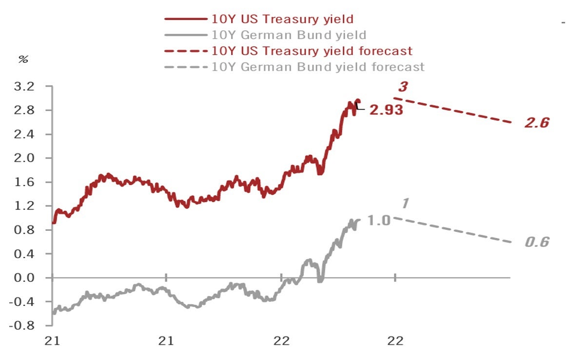 米国10年国債利回りとドイツ10年国債利回り (実績とピクテ2022年下期予想)
