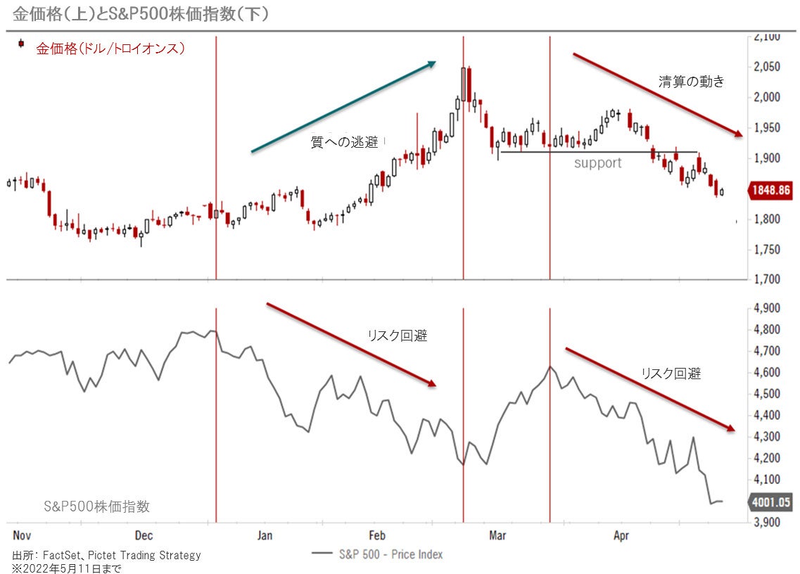 足元の金価格は、株式の急落に引きずられ下落し、安全資産としての魅力が失われてしまったようです。この理由として、ドル高とタカ派的な米連邦準備制度理事会(FRB)の動きが挙げられますが、金の買い手の不足は、より多くの広範な懸念に直面した投資家のリスク回避姿勢を反映しています (一方で、短期のテクニカルなサポートラインを破ったことで、トレンドフォロワーによる自動売り注文が発生し、金の最近の下落を悪化させた可能性もあります。)。