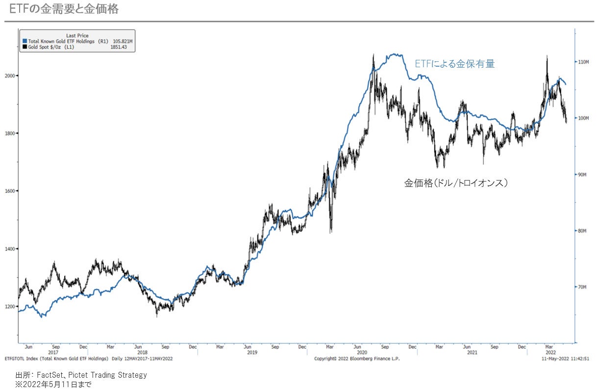 伝統的に、金価格は、収入を生まない金を保有することの機会費用が上昇するため、米国の実質金利と反対方向に動く傾向があります。下のグラフに示すように、米国の10年国債利回り(グレー、逆スケール)は、金価格の推移(赤)と乖離しています。確かに、FRBによる金融引き締めの動きを受けて米国の実質利回りは急上昇していますが、金価格はかなり持ち堪えていることがわかります。後述するように、2022年第1四半期は、金のETFの需要が金価格の支えとなったと見られます。