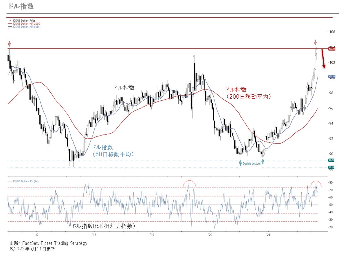 短期的には、ドル指数は2016年の高値104を目前に控え、RSIは極めて買われ過ぎの状態にあります。これは、ついに小休止が起こるかもしれないということでしょうか。もしそうであれば、現在99にある50日移動平均がサポートとして機能するはずです。