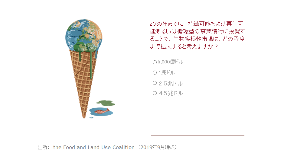 「現行の食糧および土地利用の慣行を再生可能な手法に転換することで、生物多様性および自然市場は2030年までに4.5兆ドルを創出する可能性があると考えます。」