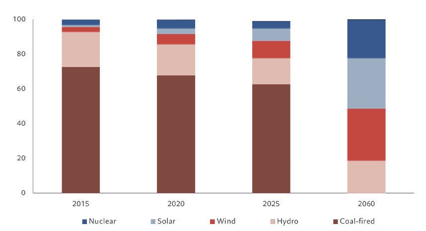 中国はCO2排出量を2030年までにピークアウト、2060年までにネットゼロの実現を目指すことを表明していますが、それと歩調を合わせて、中国の発電量における発電源別割合は急速に変化しています。今後、再生可能エネルギーは、最大の発電源である石炭を追い抜き、主力の発電源となっていくと予想されています。
