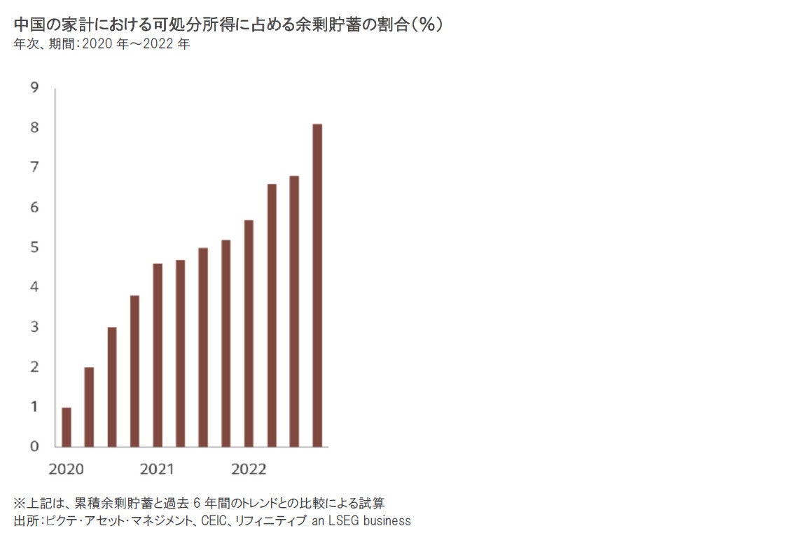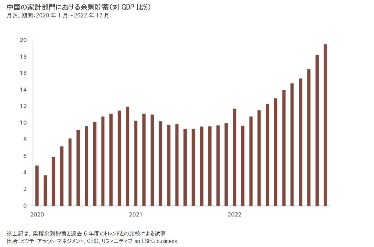しかし、ゼロコロナ政策が終了し、不動産セクターへの支援策を打ち出すなど、中国政府が政策転換する中で、中国経済はその恩恵を受けて回復に向かうとの期待は高まっています。ピクテでは2023年の中国経済について、先進国経済を上回る成長を予想しています。また、2022年年末時点では、中国の家計における余剰貯蓄(ここでは過去6年間のトレンドとの比較した試算)は可処分所得の約8%にまで拡大しており、GDP比では同20%に匹敵する規模にまで積み上がっていると推定しています。