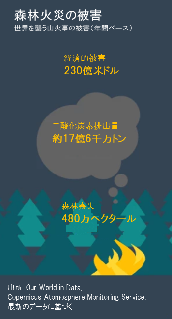 森林火災は地球の温暖化に深刻な影響を及ぼしています。欧州連合(EU)の地球観測プログラム「コペルニクス(大気監視サービス)」の報告によると、森林火災は、約17億6千万トンの二酸化炭素(CO2)を大気中に放出していますが、これは、ドイツ全土で一年間に排出されるCO2の2倍を超える量にあたります。森林火災は、野生生物や生物多様性にも甚大な影響を及ぼす他、コミュニティを破壊し、経済成長を阻害しています。