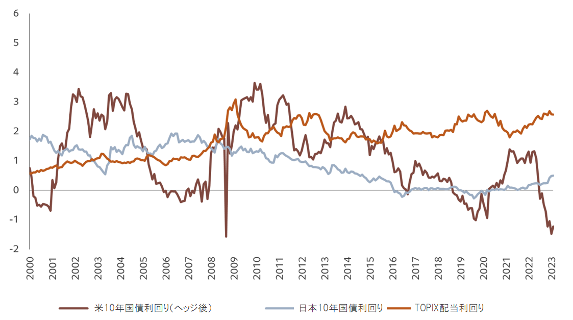 例えば、2023年2月28日時点の米ドルから円への3ヵ月のヘッジ・コストは5.2%で、米10年国債と日本10年国債の金利差は3.4%です。つまり、米国債の利回り3.9%は、ヘッジ後にはマイナス1.2%となり、2.6%の配当利回りを持つ日本株と比較すると見劣りしてしまいます2。