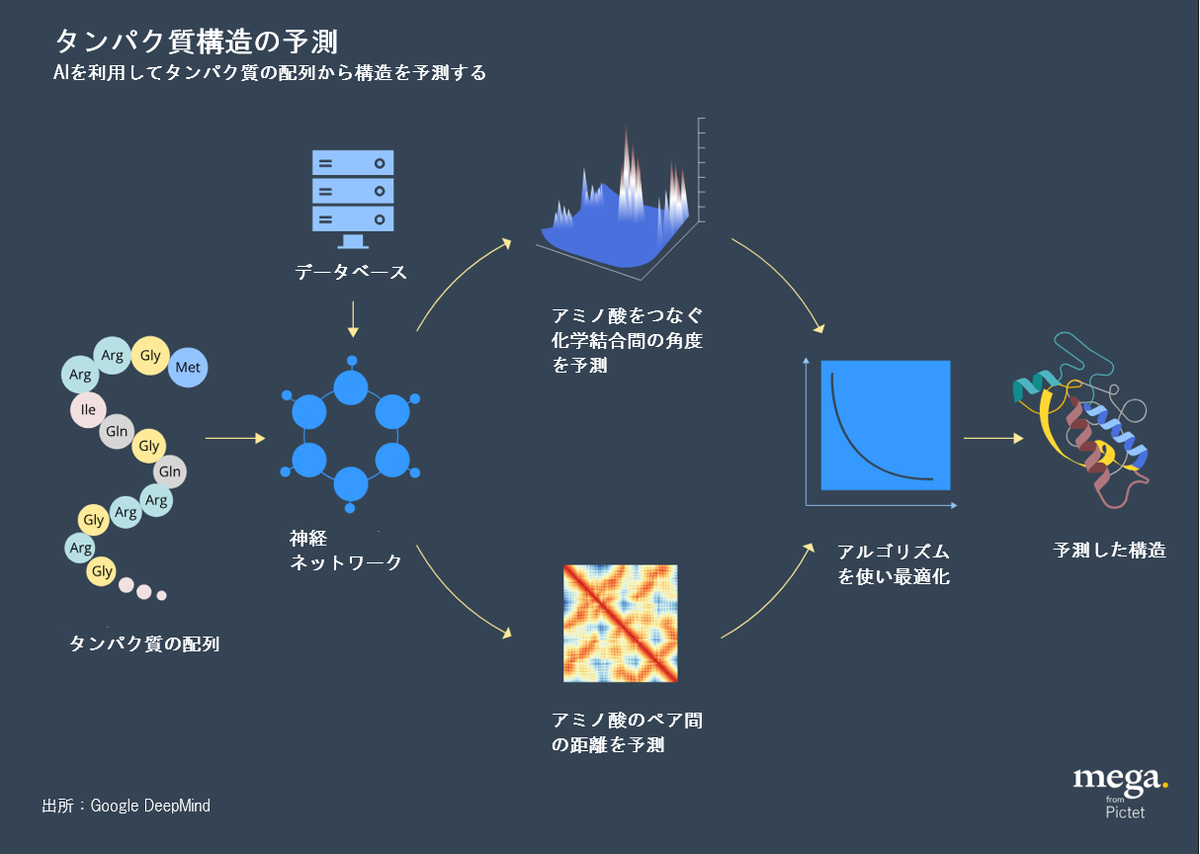 こうした状況が一変したのは、(アルファベットの子会社である)ディープマインド(DeepMind)が、政府間研究機関の欧州分子生物学研究所(European Molecular Biology Laboratory:EMBL)と提携し、人工知能プログラム、「アルファ・フォールド(AlphaFold)」を共同開発した2021年のことです。アルファ・フォールドはAIを使い、「人間の能力を遥かに凌駕するスピード」でアミノ酸配列からタンパク質構造を予測することが出来る、とバール博士は話しています。このツールは2億以上のタンパク質構造の予測を可能にしています。