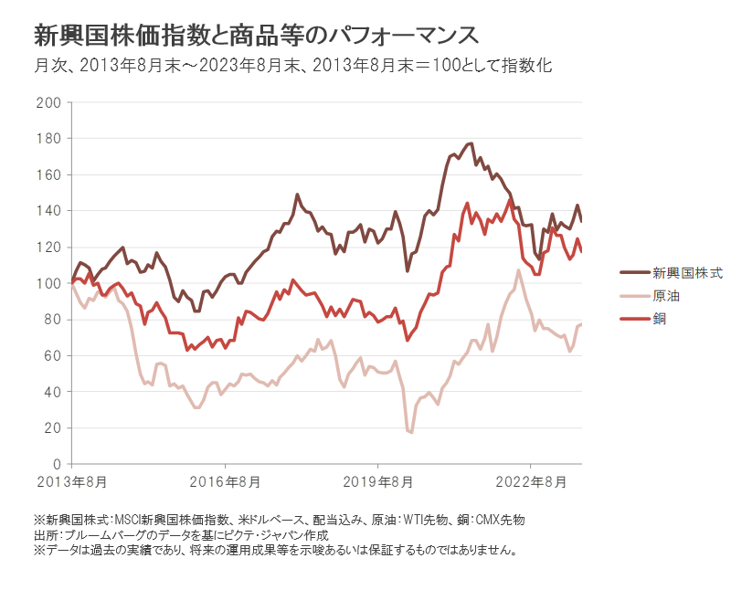 2020年のコロナショックによる下落を経て、原油や銅の価格は上昇基調となりました。その後、2022年に入り、米国の政策金利が引き上げられる中で景気減速懸念から下落しました。銅は昨年後半に反転上昇となりましたが、上値の重い展開となっています。原油は軟調な展開が継続していましたが、2023年7月以降は主要産油国の減産継続などを背景に反転しています。
