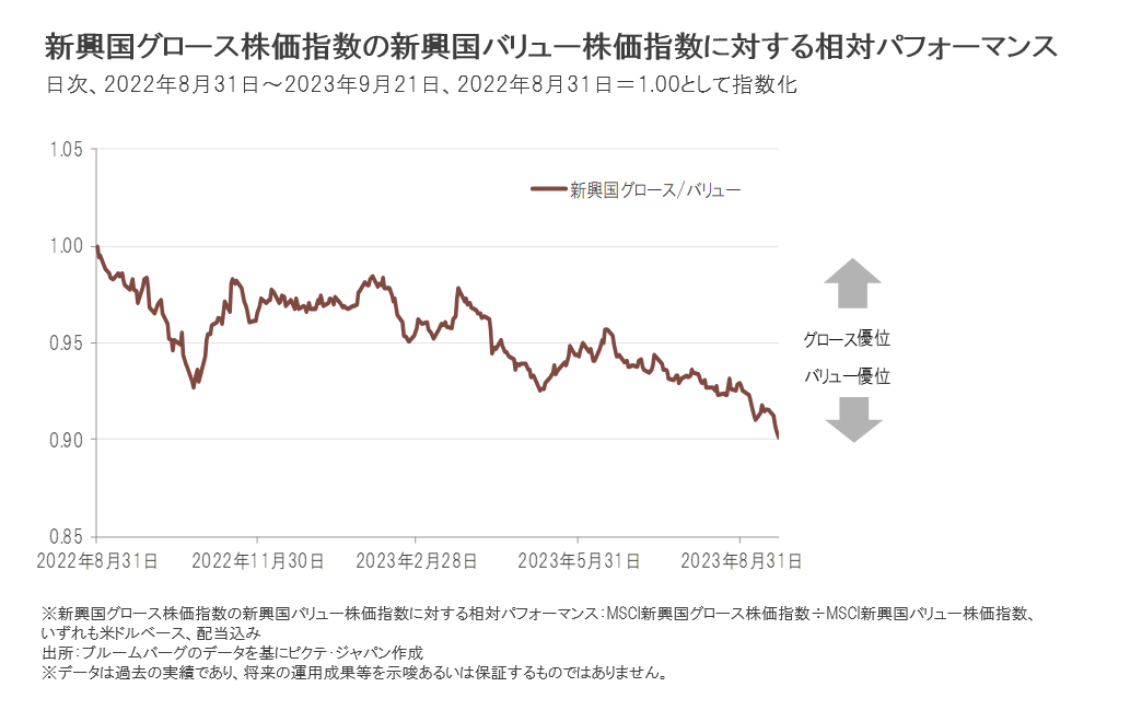 昨年来、総じてバリュー(相対的にバリュエーションの低い)銘柄の優位が続いてきましたが、5月にはAI(人工知能)関連株が注目され、新興国株式市場においてもハイテク関連中心にグロース(相対的に成長性の高い)銘柄が優位となる局面もありました。しかし、その後は再びバリュー銘柄優位に戻っています。