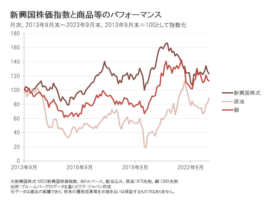 2020年のコロナショックによる下落を経て、原油や銅の価格は上昇基調となりました。その後、2022年に入り、米国の政策金利が引き上げられる中で景気減速懸念から下落しました。銅は昨年後半に反転上昇となりましたが、上値の重い展開となっています。原油は軟調な展開が継続していましたが、2023年7月以降は主要産油国の減産継続などを背景に反転しています。