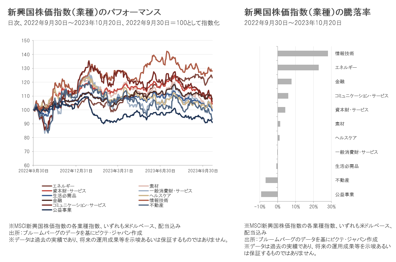 韓国や台湾の半導体、電子部品などの銘柄を中心に情報技術セクターが堅調であったほか、エネルギーセクターも中国の原油需要の増加を見込み、中国の大手エネルギー銘柄を中心に堅調でした。一方、公益事業セクターは、インドのアダニ・グループ傘下の企業のほか、中国、タイ、ブラジルなどの下落、不動産セクターは中国の銘柄の下落が目立ちました。