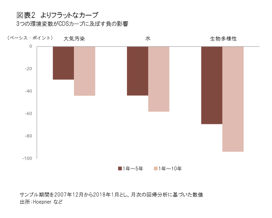 気候変動、生物多様性の喪失、大気汚染、の3つの地球の危機に対する取り組みに極めて重要で、気候変動適応コストのほぼ90%を占めるインフラ・セクターに焦点を当てたものです8。研究結果からは、生物多様性に関連するリスク管理が相対的に良好な企業は、そうでない企業に比べ、長期資金調達の条件が最大93ベーシス・ポイント(0.93%)有利であることが確認されました(図表2)。