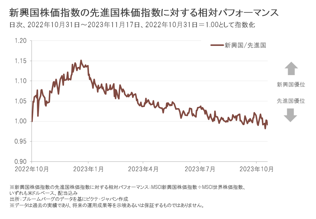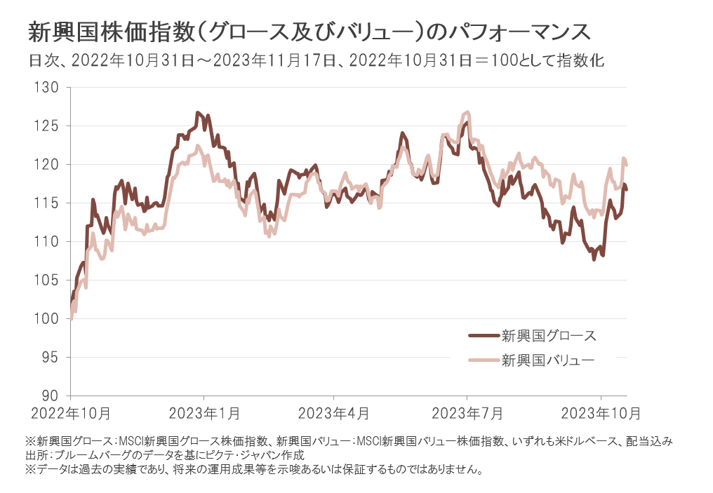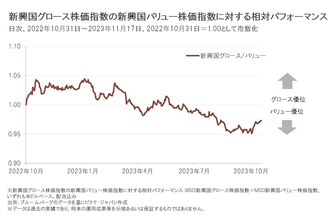5月にはAI(人工知能)関連株が注目され、新興国株式市場においてもハイテク関連中心にグロース(相対的に成長性の高い)銘柄が優位となる(相対パフォーマンスのグラフが上向きになった)局面もありましたが、その後は再びバリュー(相対的にバリュエーションの低い)銘柄優位に戻っています。足元ではグロース銘柄が優位に転じつつあります。