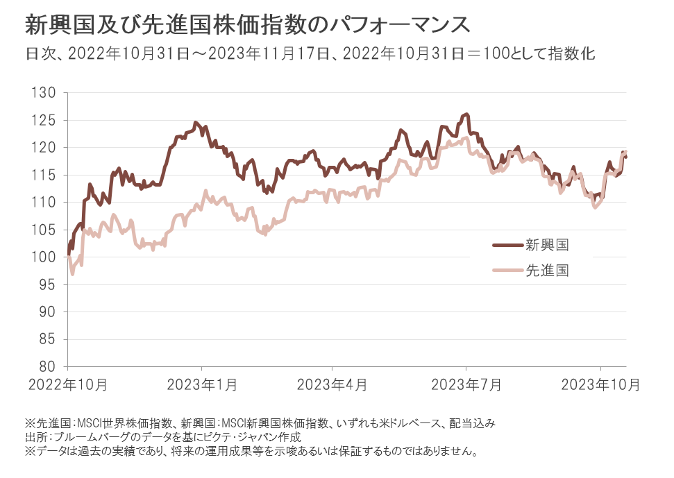 ブラジルは昨年10月の大統領選を経て、財政政策への不安感などから調整しましたが、3月には米ドル高一服からブラジルレアルが堅調となり株価も反発に転じました。8月以降、米長期金利の上昇などから上値の重い状況が続きましたが、11月に入り米国の利上げ終了期待から、米国の長期金利の低下と株価上昇をうけて上昇に転じています。