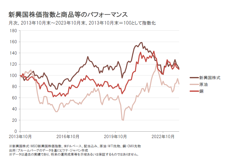2020年のコロナショックによる下落を経て、原油や銅の価格は上昇基調となりました。その後、2022年に入り、米国の政策金利が引き上げられる中で景気減速懸念から下落しました。銅は昨年後半に反転上昇となりましたが、上値の重い展開となっています。原油は軟調な展開が継続しています。2023年7月以降は主要産油国の減産継続などを背景に反転しましたが、上値が抑えられています。
