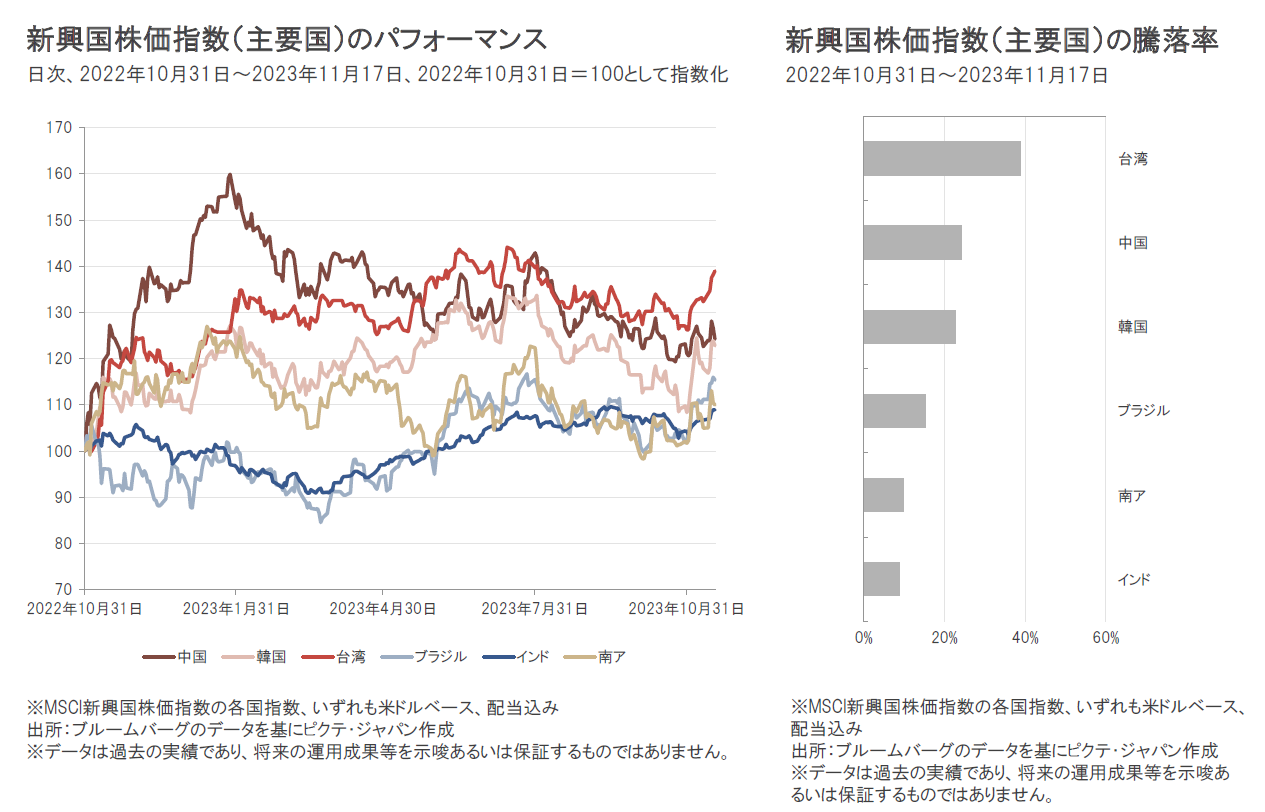 台湾及び韓国は、5月にAI(人工知能)関連株が注目され、世界的にハイテク関連株高となる中で、主力の半導体関連銘柄を中心に堅調な動きとなりました。8月以降は米国株式の上値が重い展開の中で、調整局面となっていましたが、11月に入り米国株式が上昇に転じ両国もハイテク関連を中心に堅調な動きになっています。