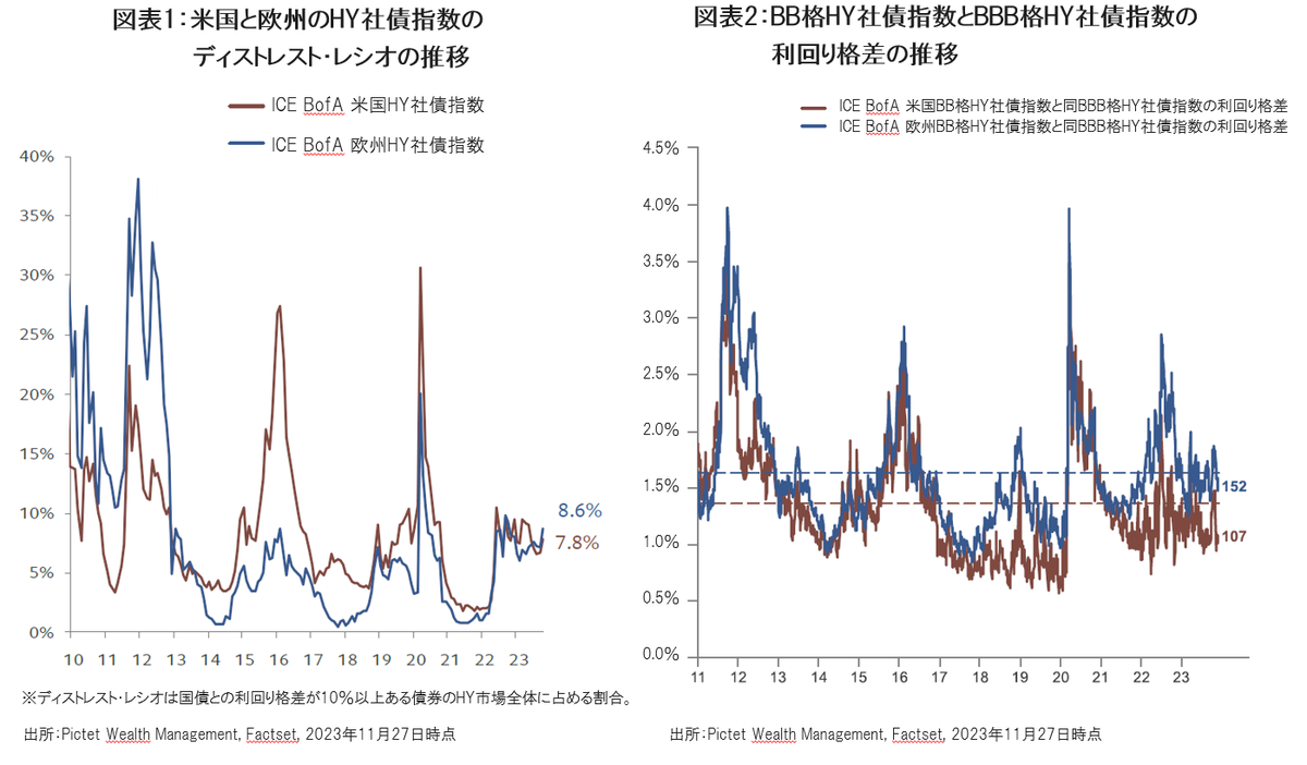 米国と欧州のBB格(HYの最上位格付)社債指数とBBB格(IGの最下位格付け)社債指数の構成銘柄との平均利回り格差は過去の中央値を下回る低水準に留まっています(図表2参照)。これは、市場参加者が足元の信用リスクを過少に評価していることを示唆していると考えられます。