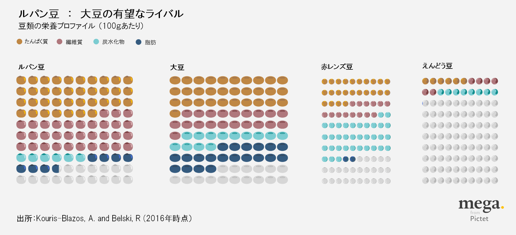 カタは、ナッツのような栄養密度の高さに注目し、タンパク質の含有量が大豆並の、カロリーあたり40%、繊維質は大豆の2倍にあたる30%を占める、と説明しています。また、ルパン豆は、ヒトの食生活に不可欠でありながら体内で作ることの出来ない、10種類の必須アミノ酸を全て含んでいます。