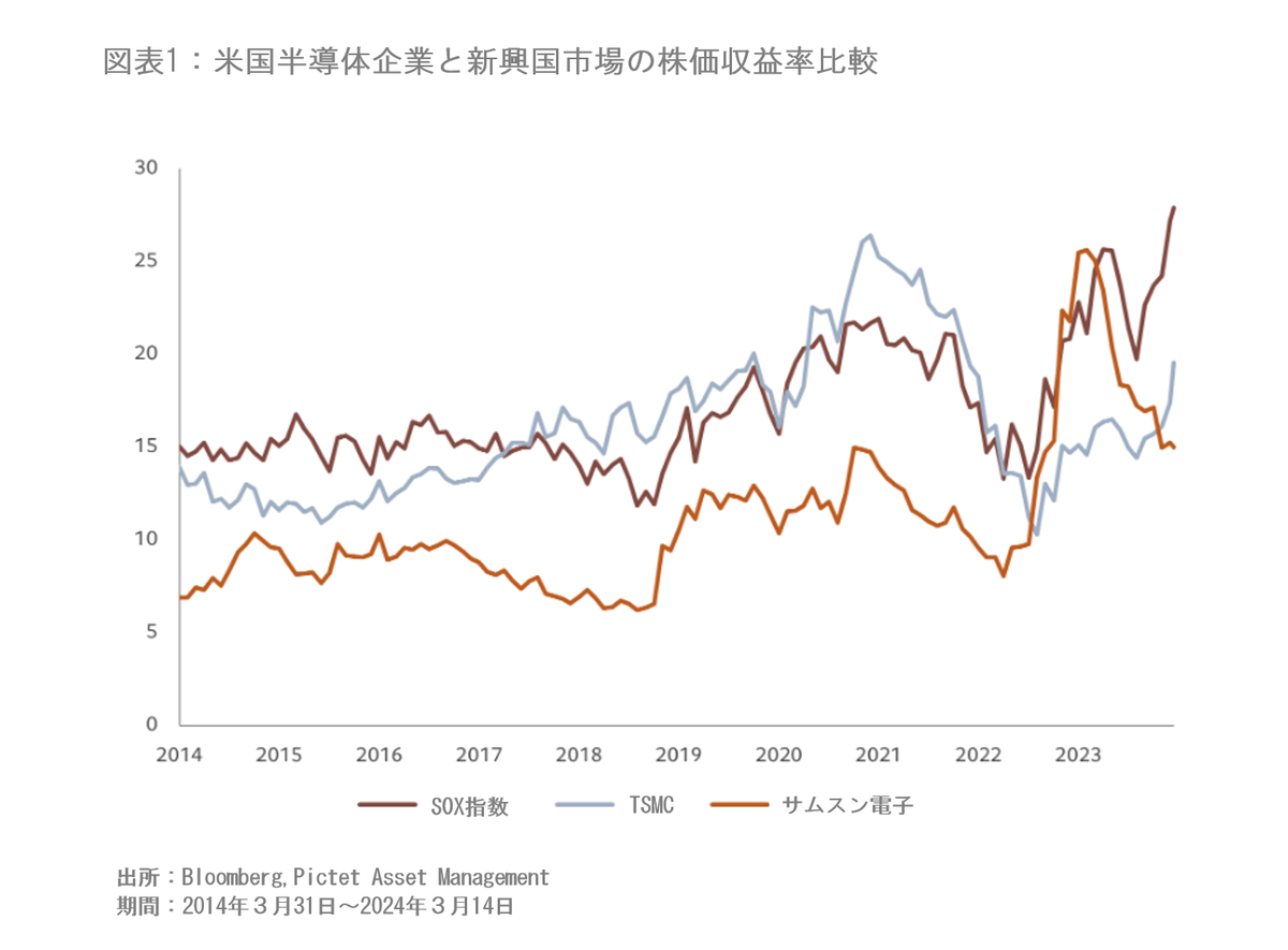 投資家にとって極めて重要なのは、こうしたアジア企業が、米国の巨大AI企業よりも遥かに低いバリュエーション水準で取引されていることです。ピクテの試算では、新興国のAIサプライチェーンを構成する企業の株価収益率(PER)の中央値は19.2倍と、米国半導体企業のPERの中央値(12ヶ月先予想利益ベース、約27倍)を大きく下回ります。