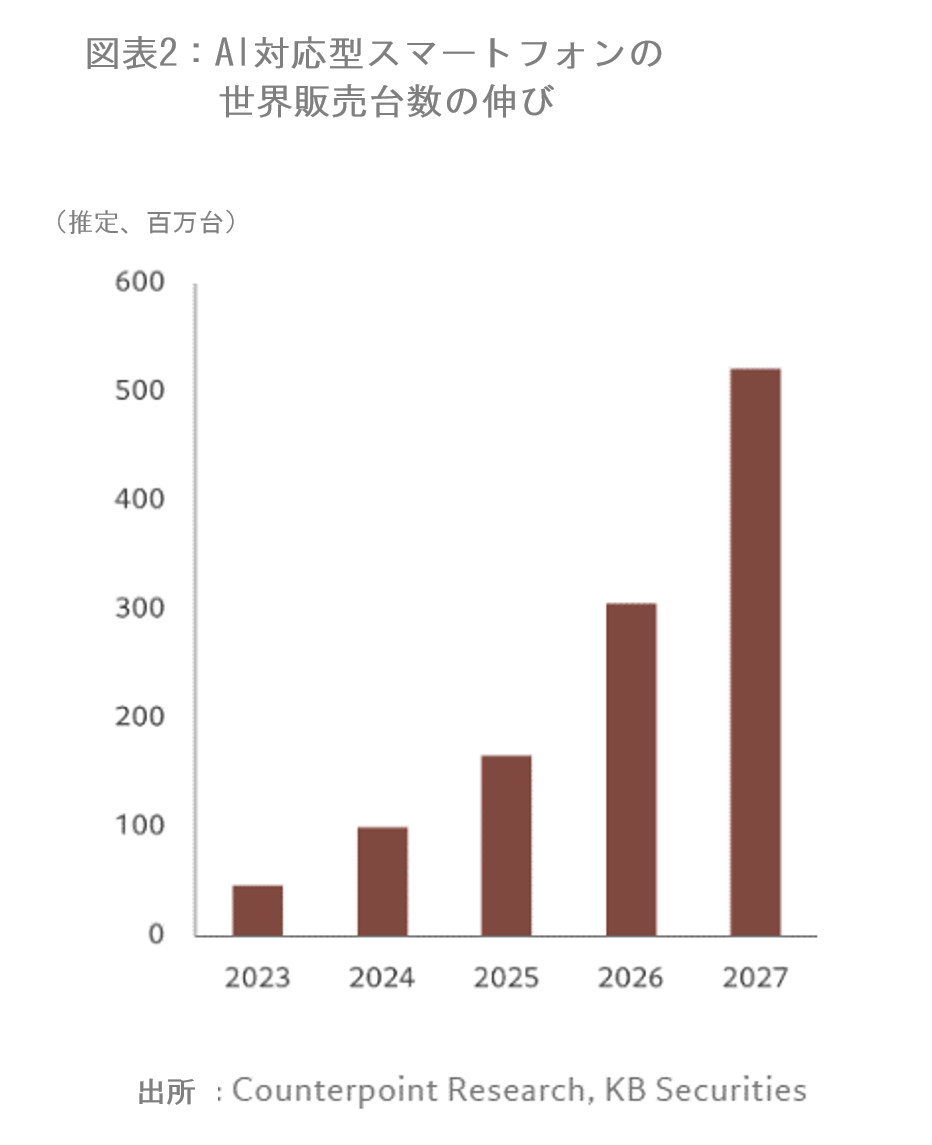 AI機能を搭載した新種のスマートフォンやパソコンの発売は、個人用ハイテク機器の買換えサイクルの到来を予想させるものであり、アジアに拠点を置くハードウェア・メーカーに、極度に偏った恩恵をもたらす可能性があると思われます。AI対応型スマートフォンの売上台数の伸びは、2027年までの年率平均ベースで80%程度に達するとのアナリスト予測も散見されます(図表2)。