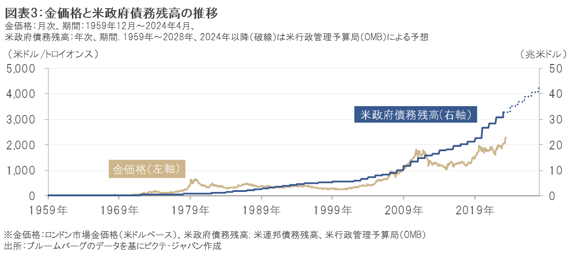 なお、基軸通貨である米ドルを発行する米国政府の債務残高は長期的に増加傾向にあり(図表3参照)、近年では政治的な対立から債務不履行が懸念される事態が発生しています。今後、米国の信用力に対する不安や、新興国の台頭に伴う米国の相対的な地位低下などを背景に米ドルに対する信認が低下した場合、代替通貨として信用リスクのない金への需要が高まると考えられます。