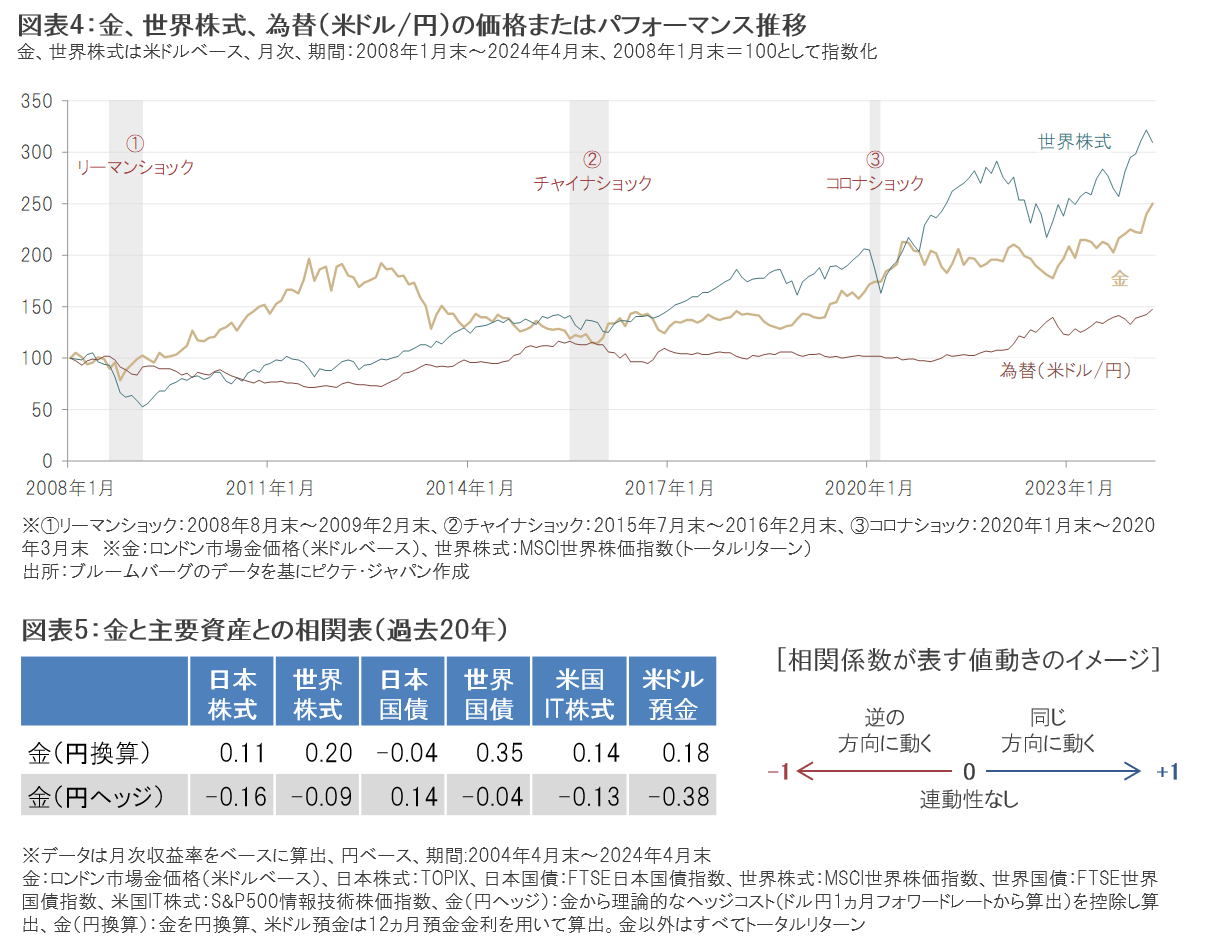 足元の投資環境においては、世界的にインフレが高水準で推移すると予想されることに加え、国家・地域間の対立や米国の大統領選挙、主要国の金融政策の動向など、不確定要素が数多く存在すると考えられます。そのような環境においては、インフレや不確実性に対するヘッジ手段といった金の特徴に加え、ポートフォリオに金を加えることで「分散投資効果」が期待されることも、金が注目を集める要因になると考えられます。