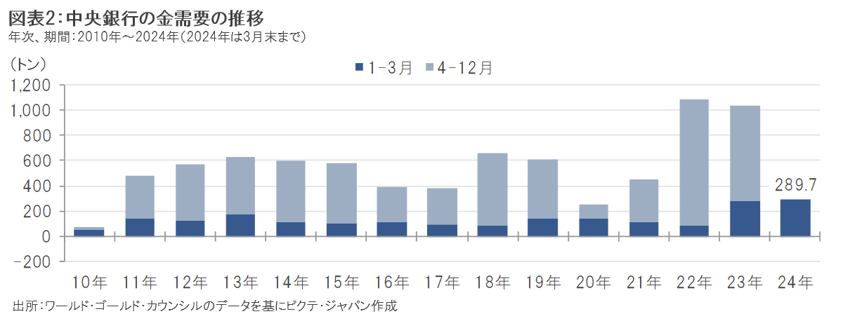 世界の中央銀行による金需要は2022年以降、インフレ圧力の増加やロシアのウクライナ侵攻などの地政学リスクの高まりなどを背景に大きく増加し、2024年1-3月期には、同期の実績としては2010年以降で最高水準となる289.7トンを記録しました(図表2参照)。世界の主要な中央銀行を対象とした調査注2では、金を保有する理由として、長期にわたる資産価値の保全に加えて、危機下における価値の安定性に対する期待や通貨分散の手段として評価する傾向が強いことが示されています。また、国際通貨システムの中で基軸通貨となっている米ドルへの依存度を下げたいという一部の新興国の思惑なども、金需要の増加につながっていると考えられます。