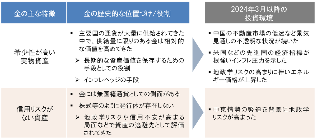 金価格は2024年3月以降、大きく上昇し、足元では過去最高値水準で推移しています。米国金利や米ドルの上昇など、2024年年初より金価格にとって逆風となる要因注1があった中でも金価格が底堅く推移した背景には、以下の表に示す金が持つ特徴への注目の高まりがあると考えられます。