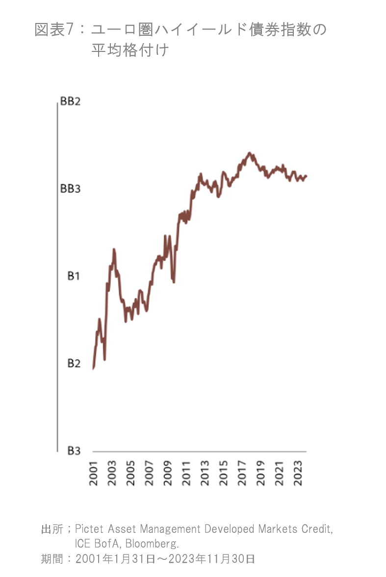 ユーロ圏ハイイールド社債の発行体の信用格付けは、過去20年で著しい改善を見せ、B2からBB3へと2段階引き上げられています。BB3格付けの社債の過去の平均デフォルト確率は0.37%とB2の0.94%を大きく下回ります。換言すると、ユーロ圏ハイイールド社債の投資家は、これまでほどデフォルトの危機に晒されていないということになります。
