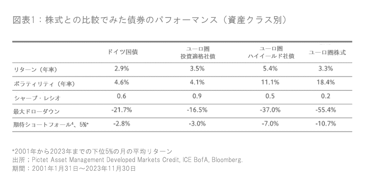 総じて、社債は伝統的な資産クラスよりも、高いシャープ・レシオ1を提供します。例えば、ユーロ圏の投資適格社債は、ドイツ国債よりも低いリスクで高いリターンを提供し、ユーロ圏のハイイールド社債は、ユーロ圏株式よりも、遥かに低いリスクで遥かに高いリターンを提供してきました。同時に、投資適格社債およびハイイールド社債の最大ドローダウン2は、それぞれ、ドイツ国債およびユーロ圏株式に比べて遥かに低く(図表1)、企業の経営破綻は社債投資家よりも株式投資家に甚大な影響を及ぼします。