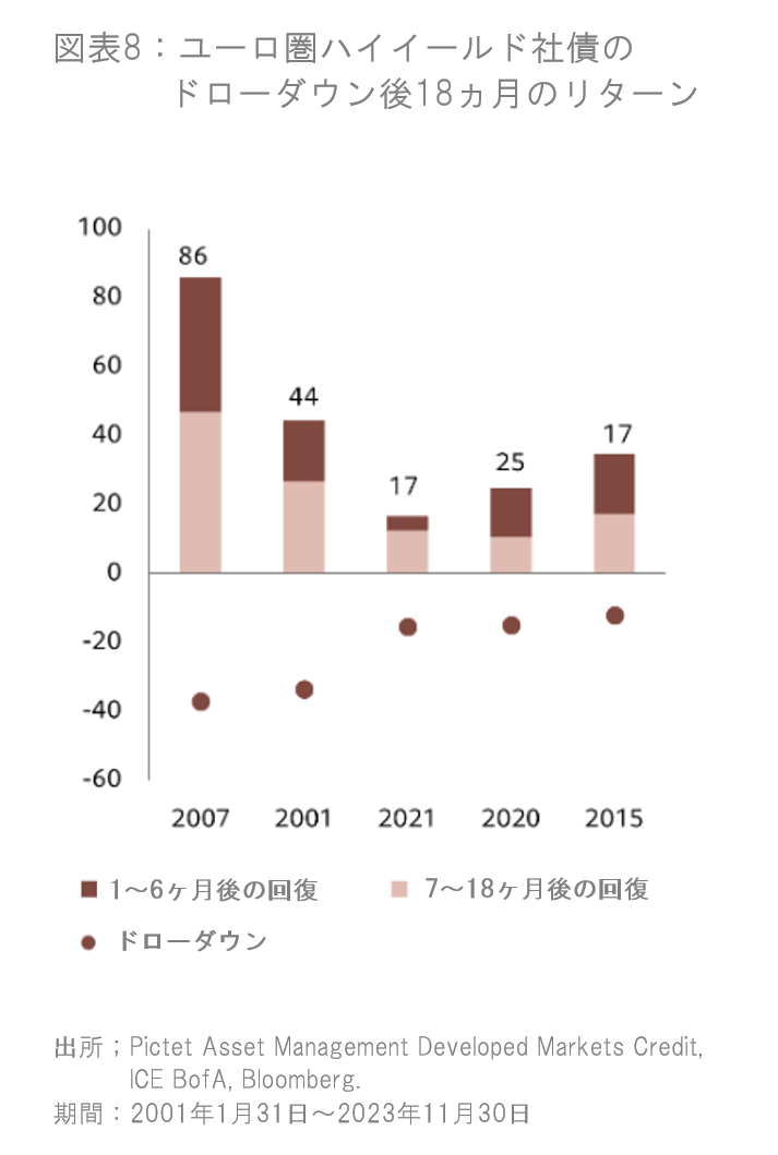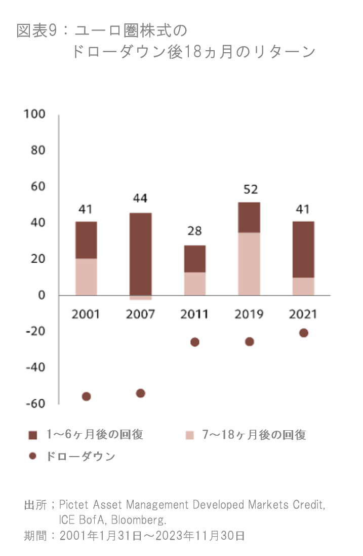 過去の例では、ユーロ圏ハイイールド社債は、少なくとも10%を超える市場のドローダウン後の18ヵ月以内に回復基調を辿り、その後、完全に回復した場合も確認されます。また、損失は市場急落後の18ヵ月以内に、常に相殺されています。市場の下落幅が10%以下の場合にも同様の結果が見られます。対照的に、ユーロ圏株式は市場の急落後の回復に債券の場合よりも長い時間を要し、回復の度合いも限られます。