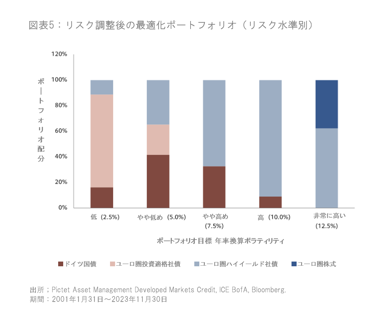 社債が選択出来る場合には、投資家のリスク許容度にかかわらず、株式と国債を組み合わせたポートフォリオから最適ポートフォリオを構築することは出来ません(図表5)。目標とするリスク水準ごとに社債を組み入れることで、より最適なポートフォリオが構築出来るからです。