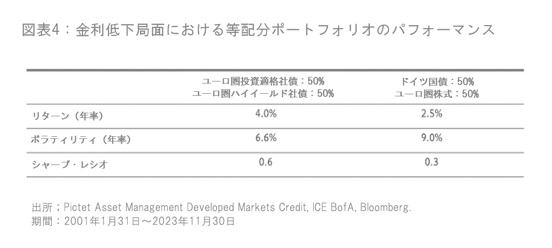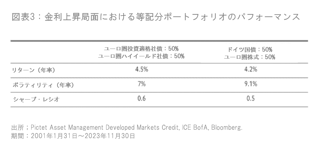 欧州ハイイールド社債が初めて発行された2001年以降、欧州の投資適格社債とハイイールド社債をバランスよく組み合わせたポートフォリオが、ドイツ国債とユーロ圏株式の等配分ポートフォリオを上回るリターンをあげていたことが推測されるからです。また、前者のリスク・リターン特性が、金利上昇局面ならびに低下局面の双方で、後者よりも良好であったことも注目されます。